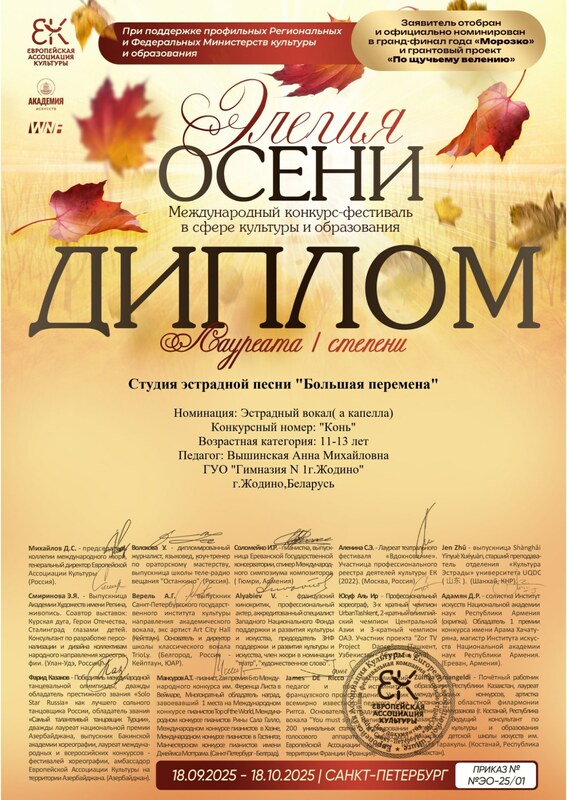 С 18.09.25 по 18.10.25 в Санкт-Петербурге прошел Международный конкурс-фестиваль в сфере культуры и образования "Элегия осени". Артисты образцовой студии эстрадной песни "Большая перемена", руководитель Анна Вышинская, показали наилучший результат, став лауреатами 1 степени.