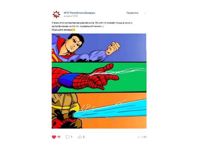 Специально для аудитории, которую сегодня принято называть «миллениалами», существует паблик ВКонтакте. Ежедневно лента пополняется как интересными фактами о пожарной службе, так и веселым познавательно-развлекательным контентом: фотожабами, гифками, тематическими шутками и лучшими образцами наглядно-изобразительной продукции МЧС.